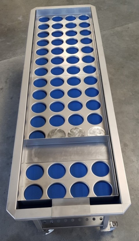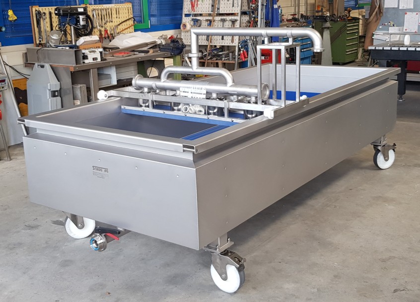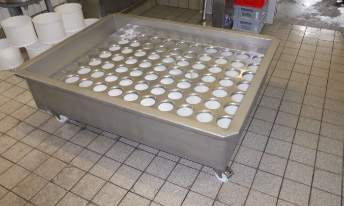 Abfüll/Presswanne für Alpbetrieb: Bruchverteilerwagen von Hand verschiebbar